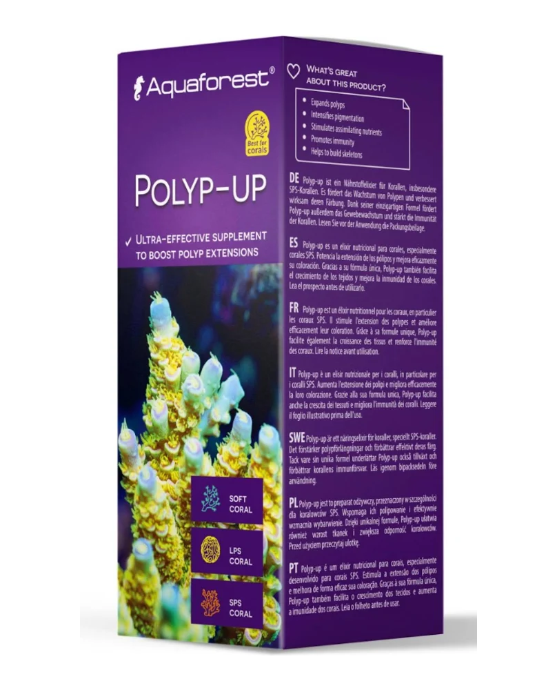 Polyp-up es una fuente de grasas insaturadas Omega-3 y Omega-6, así como de vitaminas y aminoácidos. Las extensiones de pólipos más largas facilitan la recolección de alimento del agua. No solo intensifica la saturación, sino que también promueve la asimilación de nutrientes, acelerando así el crecimiento del tejido y la construcción de los esqueletos coralinos.